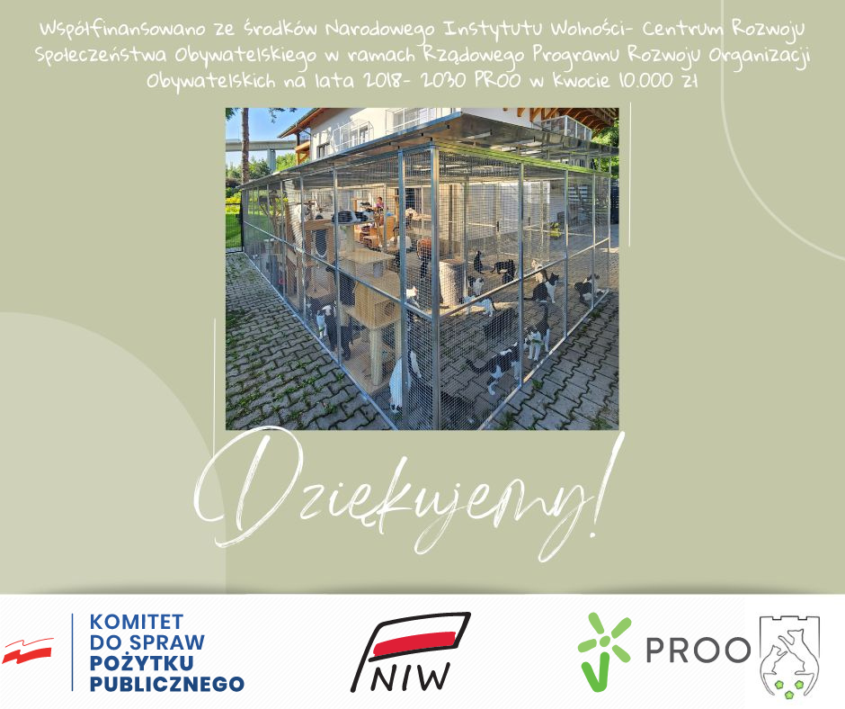 Pomimo że jesteśmy stosunkowo młodą organizacją, nasze dotychczasowe działania zostały zauważone. Nasz projekt złożony do Narodowego Instytutu Wolności, poparty rekomendacją Pani Burmistrz Miasta Gabrieli Staszkiewicz oraz Wydziału Ochrony Środowiska i Rolnictwa Urzędu Miasta Cieszyna, uzyskał pozytywną ocenę i został przeznaczony do realizacji. Uzyskaliśmy dofinansowanie w wysokości 10 000 zł, dzięki któremu było możliwe rozbudowanie naszej woliery zewnętrznej dla kotów oraz przystosowanie jej dla odwiedzających seniorów oraz osób niepełnosprawnych.